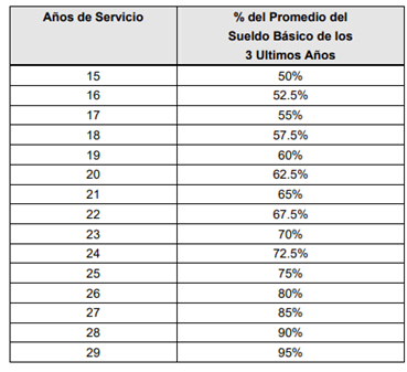 De igual manera, así como la ley del ISSSTE, la caja tiene una tabla que regula el porcentaje del promedio del sueldo básico de los años se servicio cotizados, la cual es la siguiente: